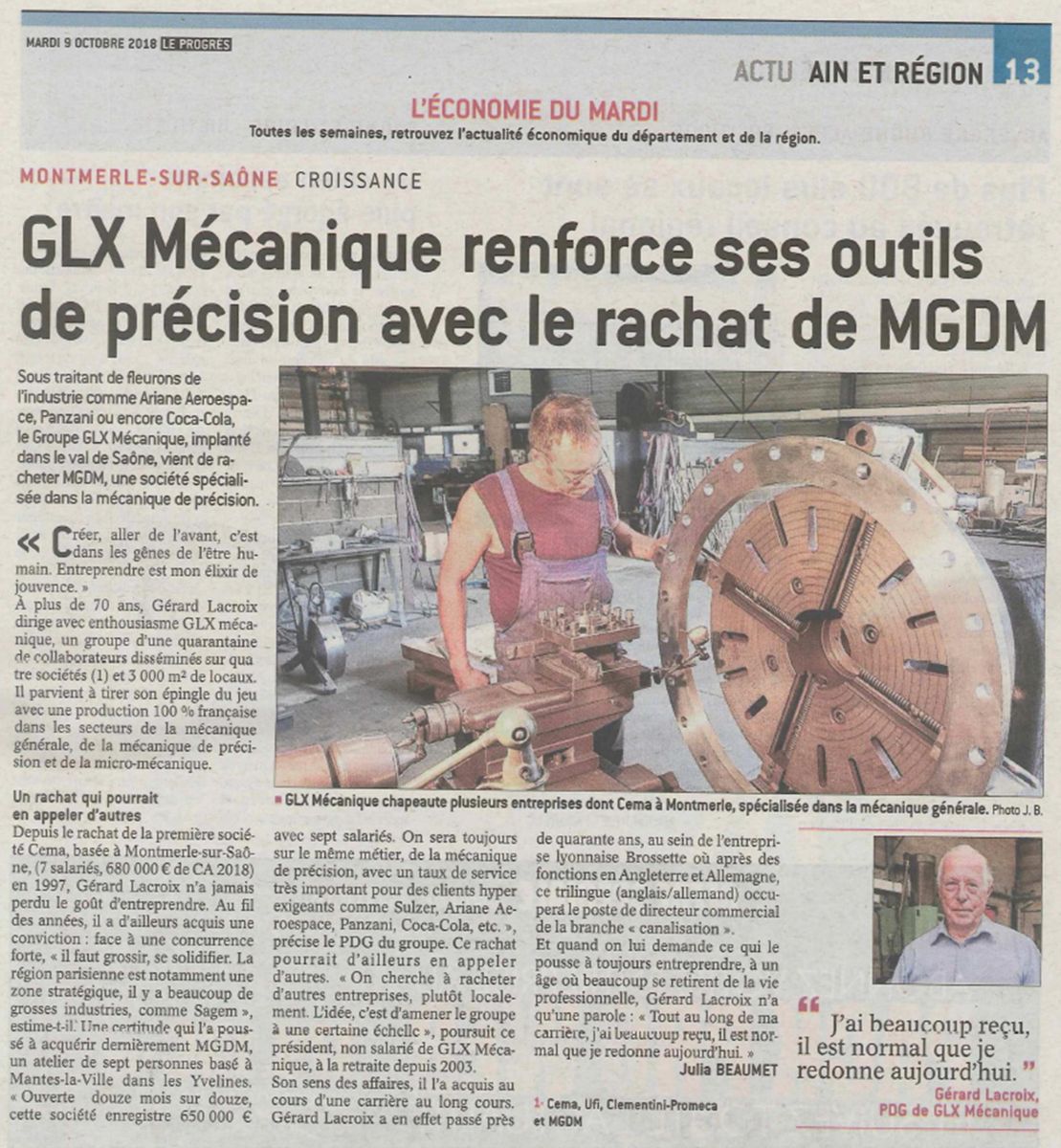 Gérard Lacroix a été interviewé par Julia Beaumet qui a réalisé un reportage sur le groupe GLX MECANIQUE. L’article de presse a été publié dans le journal Le Progrès du 9 Octobre 2018.