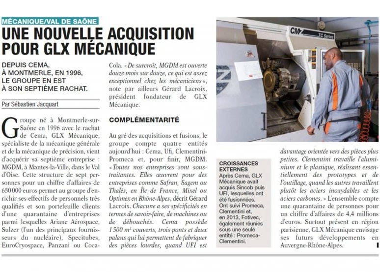 Groupe né à Montmerle-sur-Saône en 1996 avec le rachat de CEMA, GLX Mécanique, spécialiste de la mécanique générale et de la mécanique de précision, vient d’acquérir sa septième entreprise : MGDM, à Mantes-la-Ville, dans le Val d’Oise. Cette structure de sept personnes pour un chiffre d’affaires de 650 000 euros permet au groupe d’enrichir ses effectifs de personnels très qualifiés et son portefeuille clients d’une quarantaine d’entreprise parmi lesquelles Ariance Aérospace, Sulzer (l’un des principaux fournisseurs du nucléaire), Spécitubes, EuroCryospace, Panzani ou Coca-Cola.